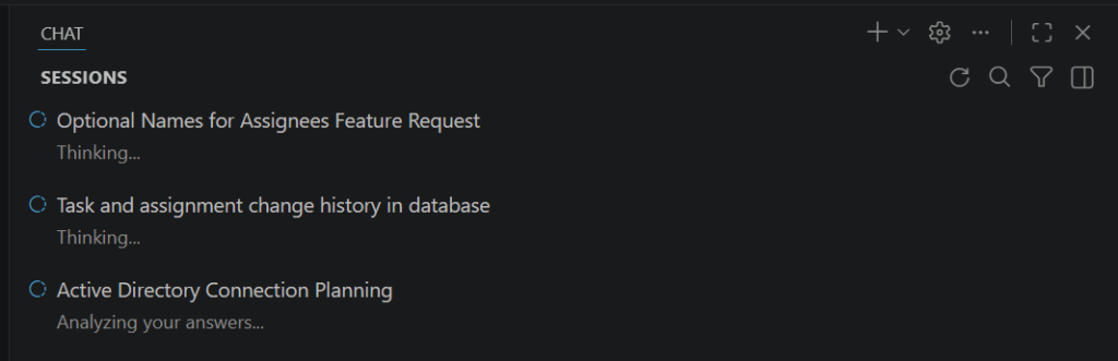 Learning 3: Parallelize: In the screenshot below you can see 3 sessions running in parallel. This takes quite a mental load. I am yet undecided if I really can handle more than one thread without causing too much turmoil in my project.